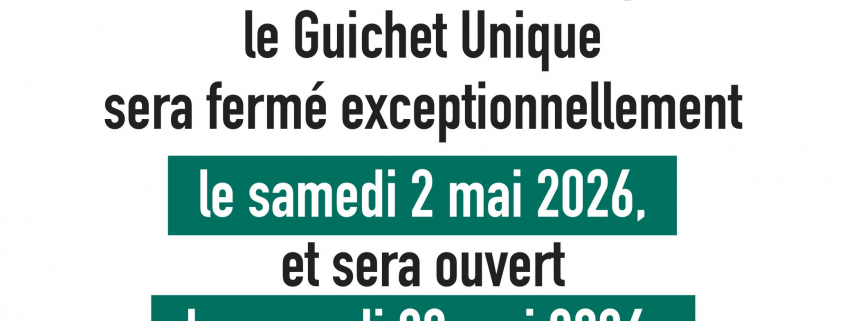 Fermeture exceptionnelle du guichet uniqueActualités Fermeture exceptionnelle du guichet unique le samedi 2 mai 2026 et sera ouvert le mardi 23 mai 2026 Merci de votre compréhension. Partager :ImprimerFacebookTwitterE-mail28 avril 2026 https://ville-villepinte.fr/wp-content/uploads/2026/04/FERMETURE-GUICHET-UNIQUE-MAI-26-Mise-en-page-1-scaled.jpg 2560 1809 Délia Bouziane https://ville-villepinte.fr/wp-content/uploads/2021/01/ville-villepinte.png Délia Bouziane2026-04-28 15:57:262026-04-28 15:59:50Fermeture exceptionnelle du guichet unique
