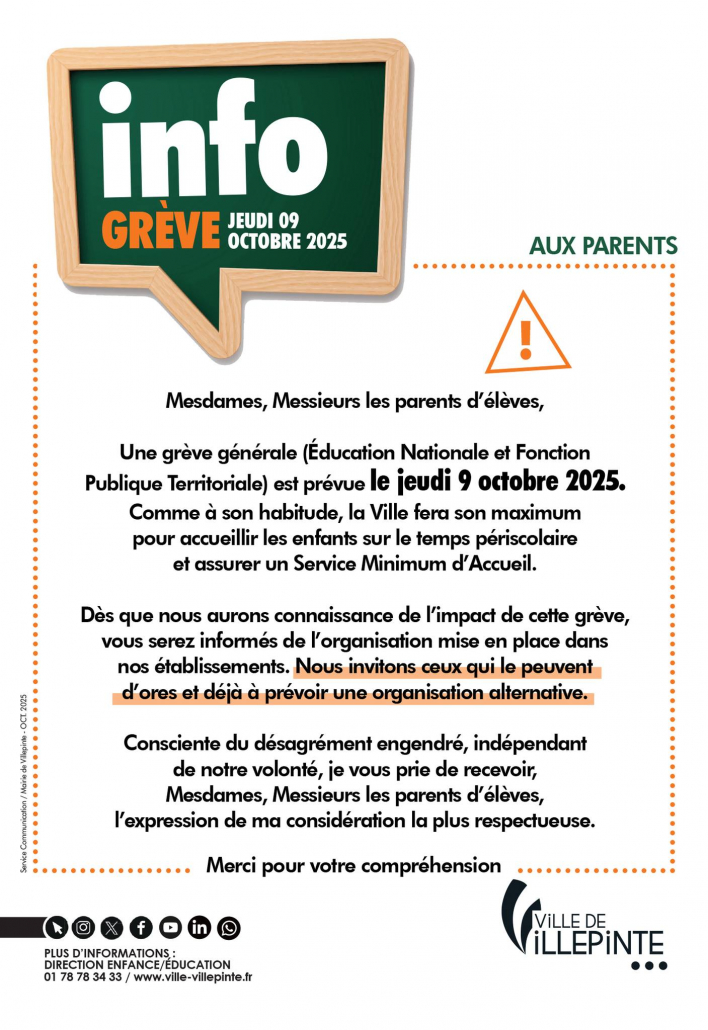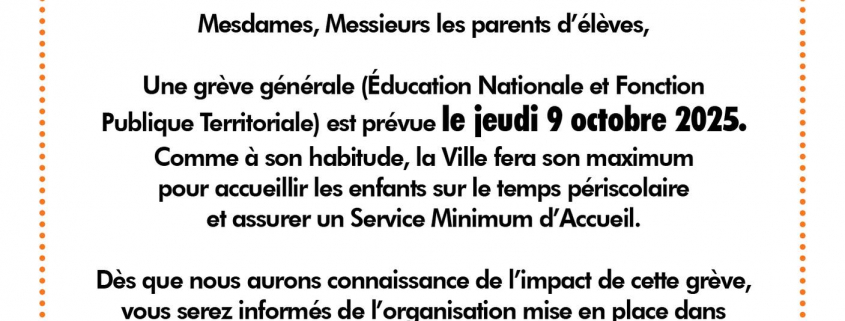 Une grève générale (Éducation Nationale et Fonction Publique Territoriale) est prévue le jeudi 9 octobre 2025. Comme à son habitude, la Ville fera son maximum pour accueillir les enfants sur le temps périscolaire et assurer un Service Minimum d’Accueil.