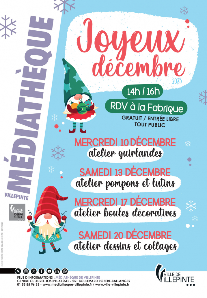 La Médiathèque de Villepinte vous invite à célébrer la magie des fêtes de fin d’année avec une série d’ateliers créatifs gratuits et ouverts à tous !